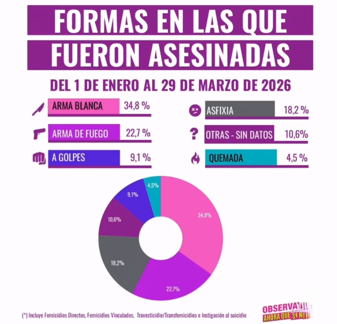 Entre el 1 de enero y el 29 de marzo relevamos, a partir del análisis de medios de comunicación: 66 víctimas fatales: 57 femicidios directos, 6 femicidios vinculados, 2 instigaciones al suicidio y 1 travesticidio/transfemicidio.