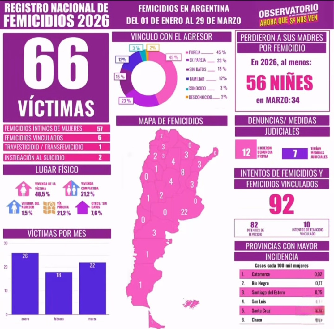 Entre el 1 de enero y el 29 de marzo relevamos, a partir del análisis de medios de comunicación: 66 víctimas fatales: 57 femicidios directos, 6 femicidios vinculados, 2 instigaciones al suicidio y 1 travesticidio/transfemicidio.