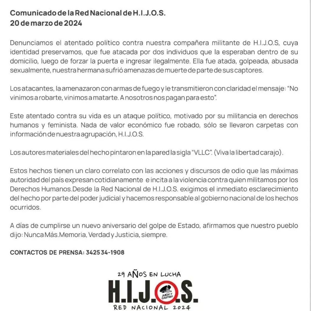 A escasas horas de una nueva marcha por el 24M por la Memoria, la Verdad y la Justicia, un comunicado de la Red Nacional H.I.J.O.S alertó sobre un hecho gravísimo ocurrido a una militante de la Agrupación
