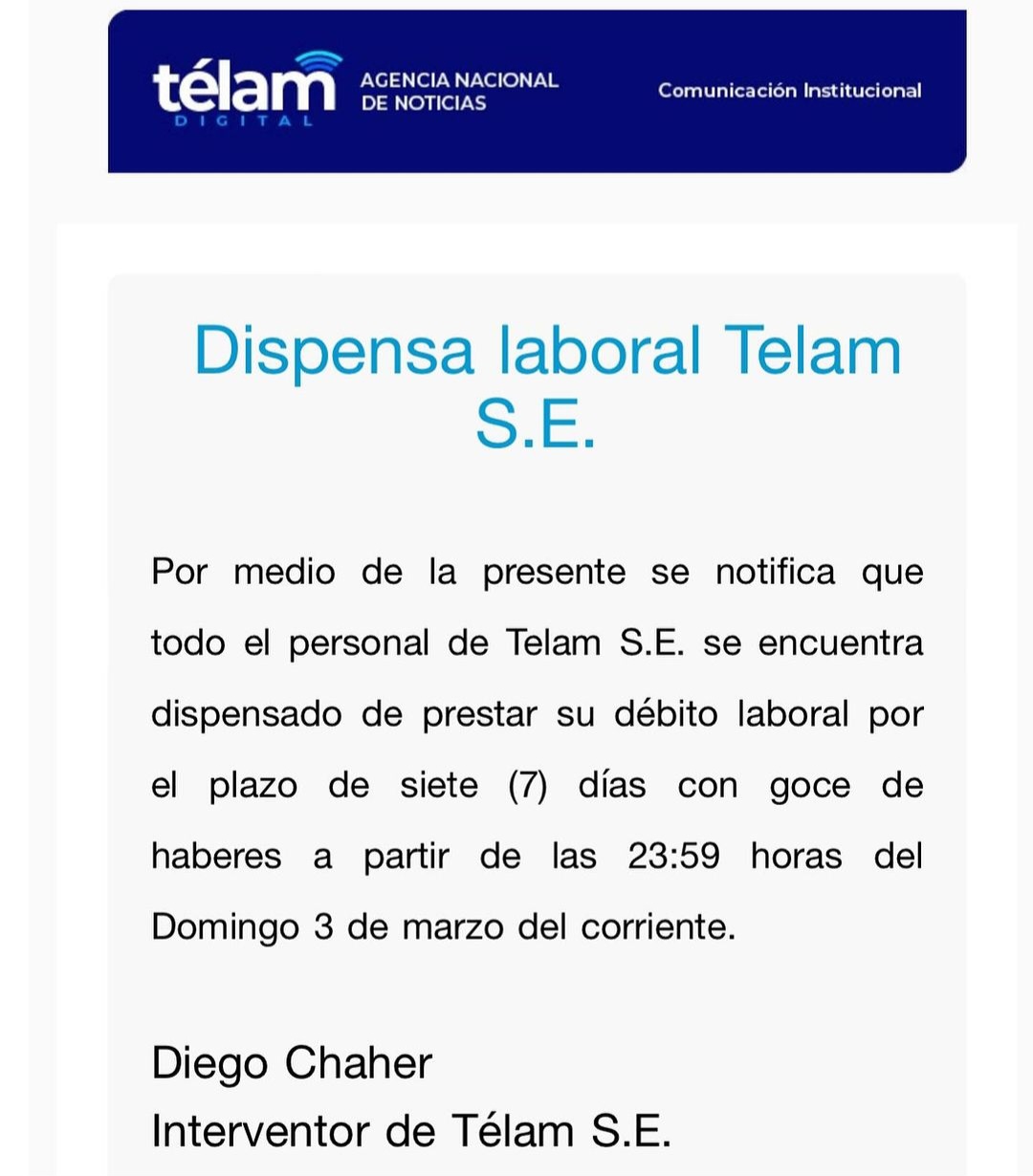 Miembros de la Policía de la Ciudad se acercaron a las sedes en Capital Federal de Télam (Avenida Belgrano 357, Defensa 372 y Bolivar 531) y procedieron a vallar el edificio cuando aún se encontraban dentro trabajadores. Paralelamente el interventor Diego Chaher enviaba mails a los más de 700 profesionales “dispensándolos” por trabajar por siete días