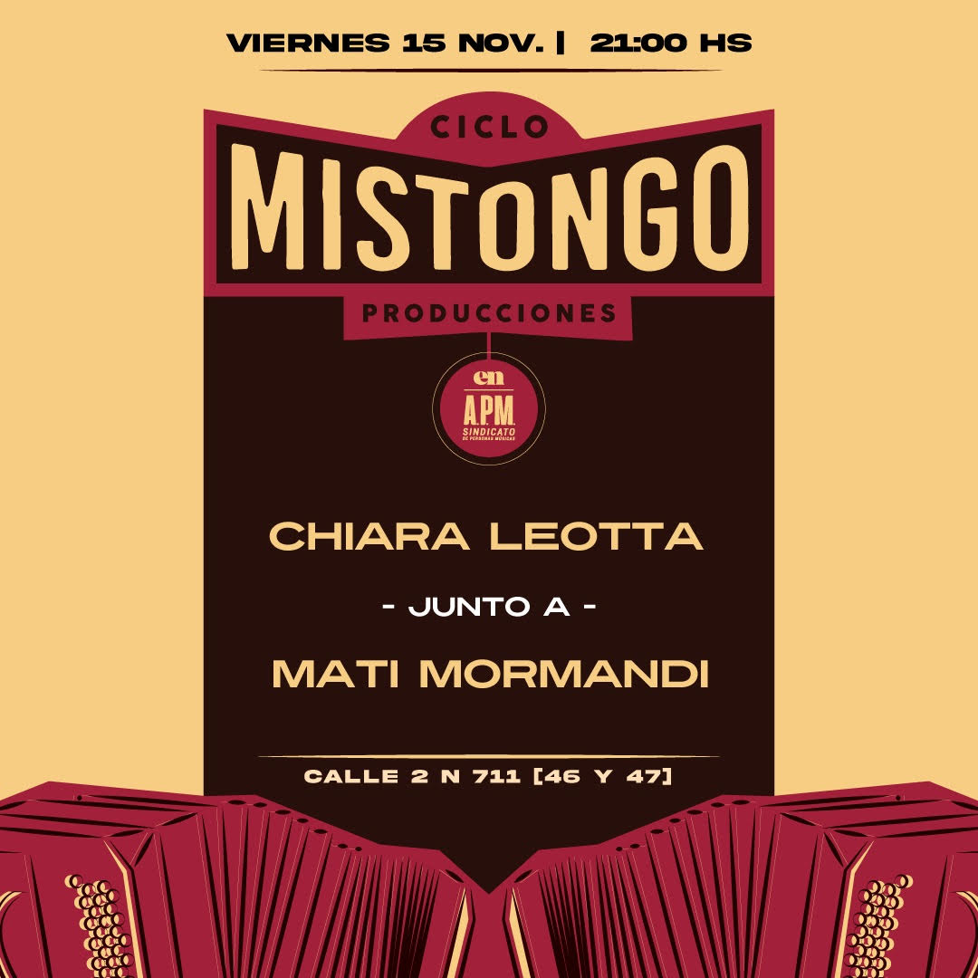 Este viernes 15 de noviembre en su ya clásico programa doble el Ciclo Mistongo presentará a la joven cantante, compositora, guitarrista y artista plástica Chiara Leotta y a Mati Mormandi, pianista, cantor y compositor de largo trajinar en la escena de la canción popular. El concierto promete lo mejor y más reciente del repertorio de ambos, que a través de composiciones originales evocará paisajes sonoros comunes como la milonga, el candombe, el tango, la canción rioplatense y latinoamericana.