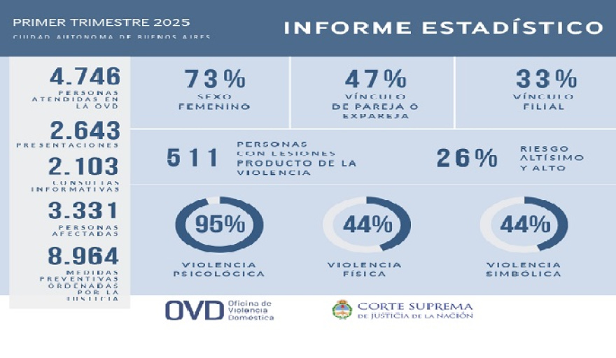 Durante el primer trimestre de 2025, las denuncias por violencia doméstica en Argentina crecieron un 9%, y las mujeres representaron el 73% de las personas afectadas, según un informe elaborado por la Oficina de Violencia Doméstica (OVD) de la Corte Suprema de Justicia de la Nación.