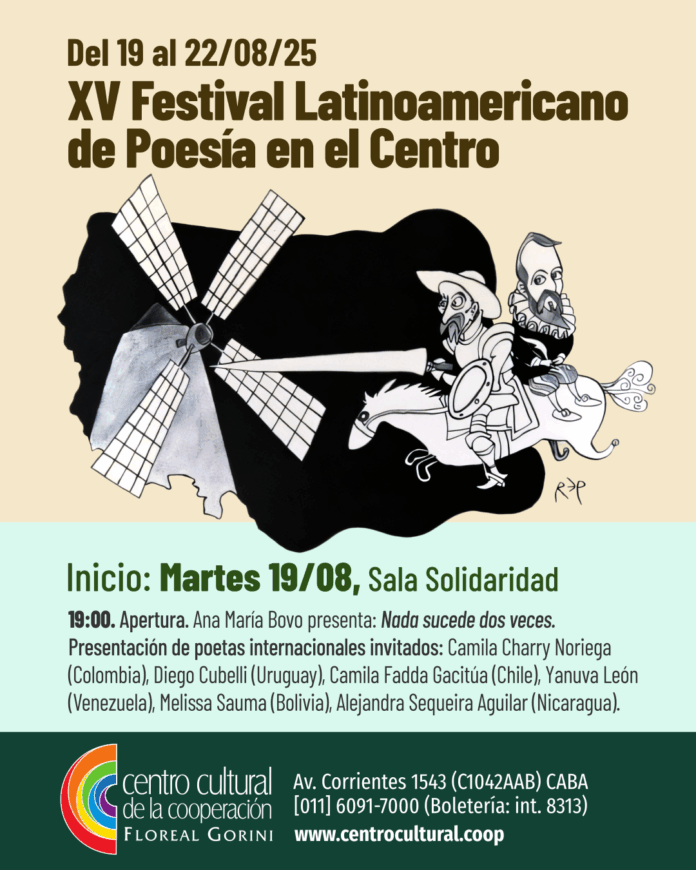 19.OO. Apertura. Ana María Bovo presenta: “Nada sucede dos veces”. Presentación de los poetas internacionales invitados: Camila Charry Noriega (Bogotá, Colombia), Diego Cubelli (Montevideo, Uruguay), Camila Fadda Gacitúa (Santiago, Chile), Yanuva León (Miranda, Venezuela), Melissa Sauma (Santa Cruz, Bolivia), Alejandra Sequeira Aguilar (Managua, Nicaragua).