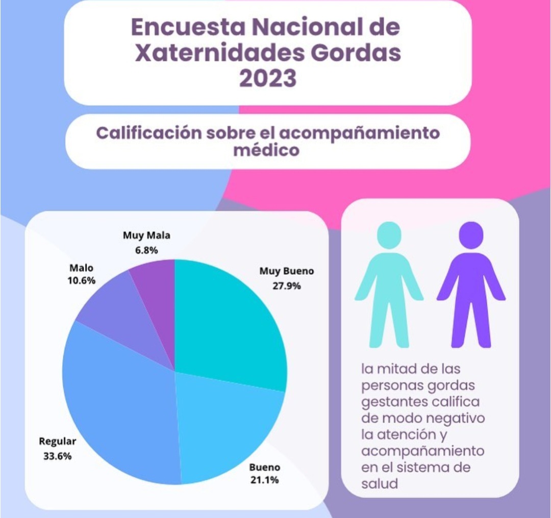 Carolina nos contó algunos datos fuertes “Una de cada dos personas gordas calificaron como buena la atención – o sea para el 50% fue mala- pero lo llamativo fue que quienes la calificaron como buena o muy buena, fueron los que pudieron pagar para encontrar personas empáticas, no peso centristas, y no violentas en la cuestión del acompañamiento del embarazo”