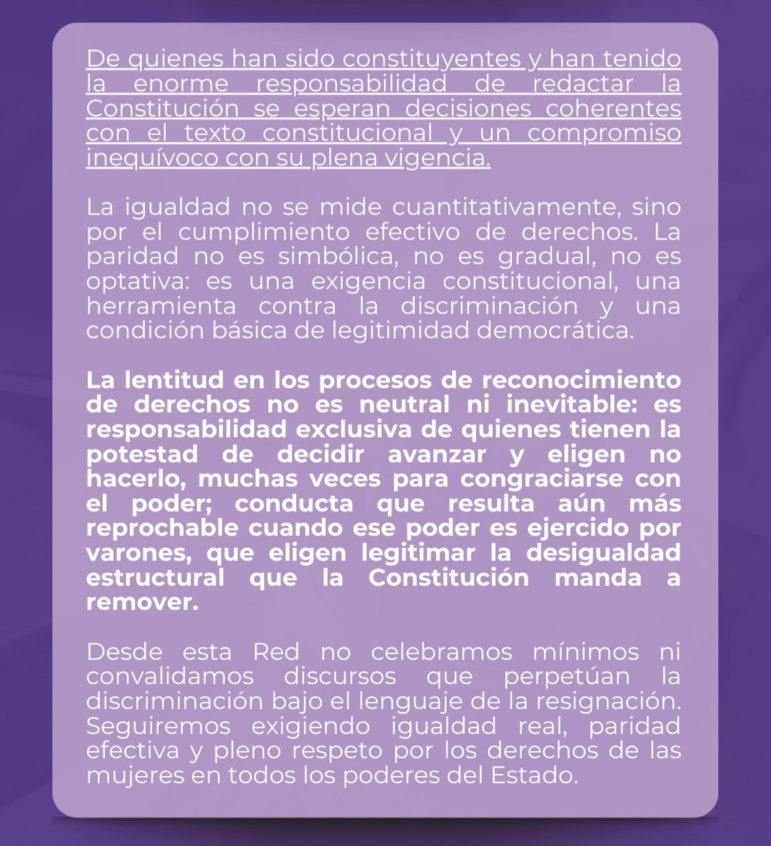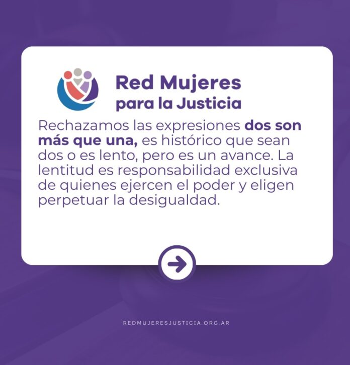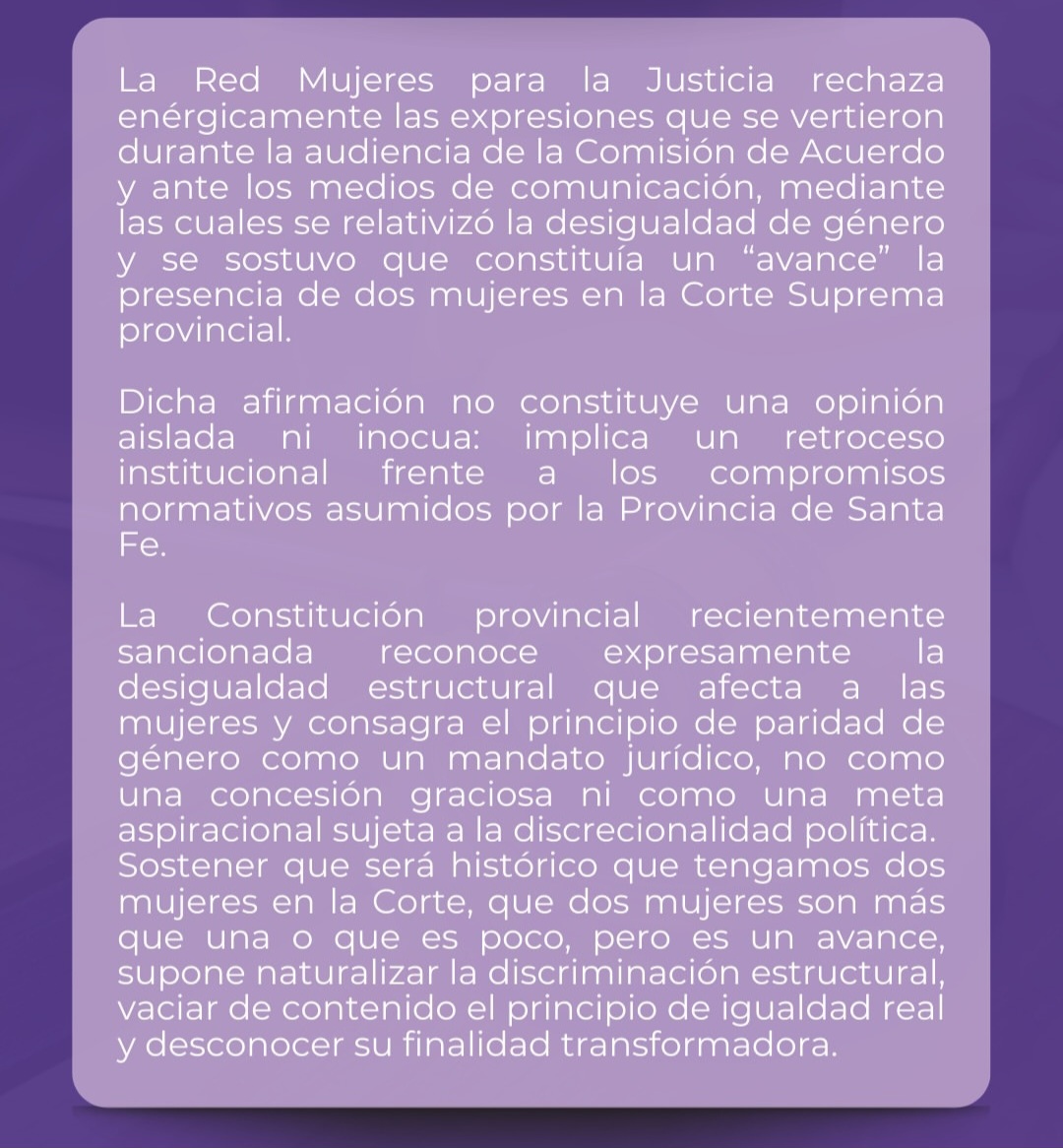 Las mujeres que conforman la Red de Mujeres para la justicia emitió un duro comunicado rechazando las expresiones vertidas en medios de comunicación y ámbitos de la Justicia que expresaban un gran avance el hecho de que en la provincia se hayan incorporado dos mujeres a la Corte Suprema.