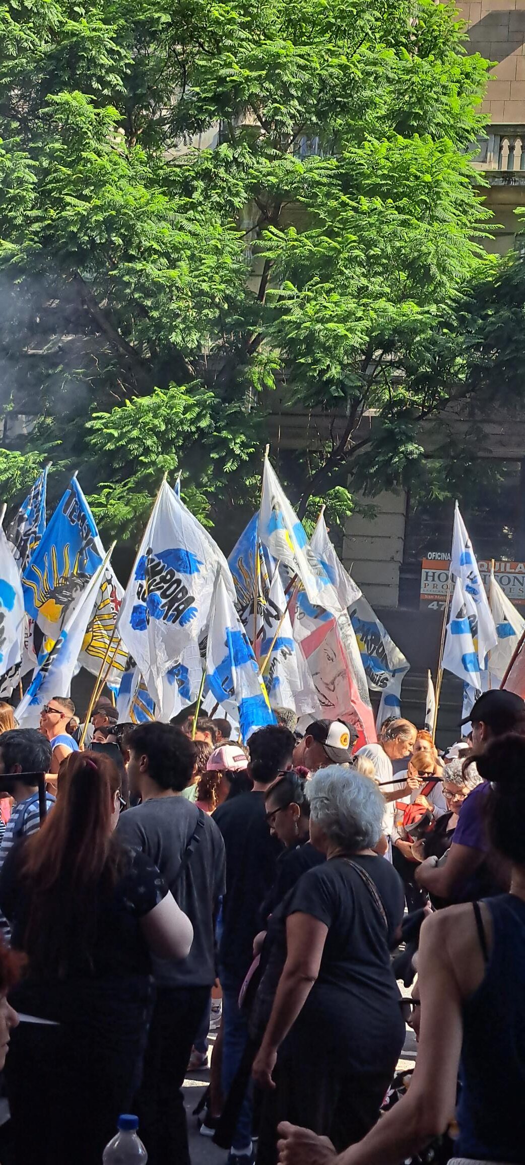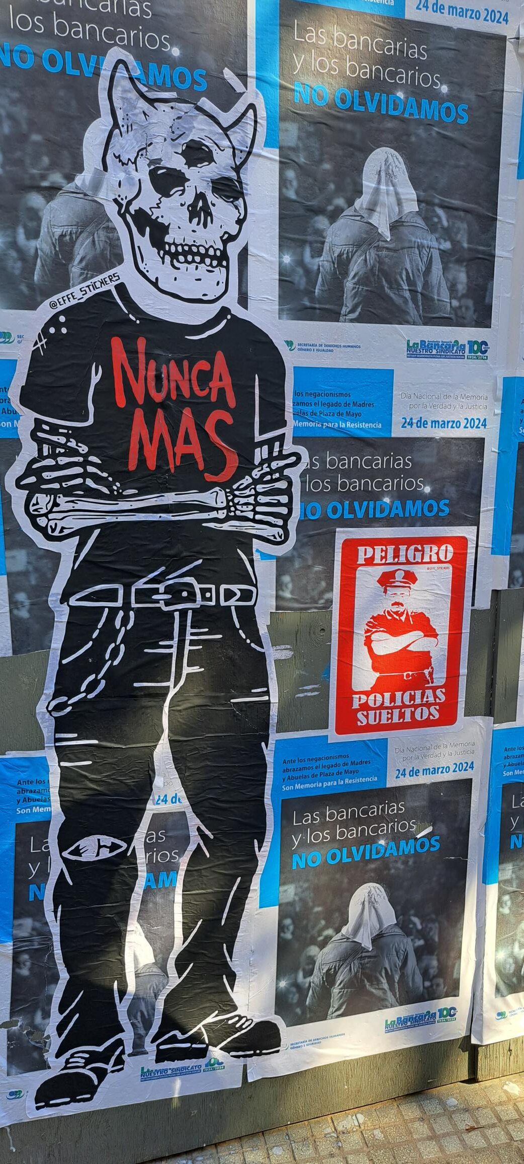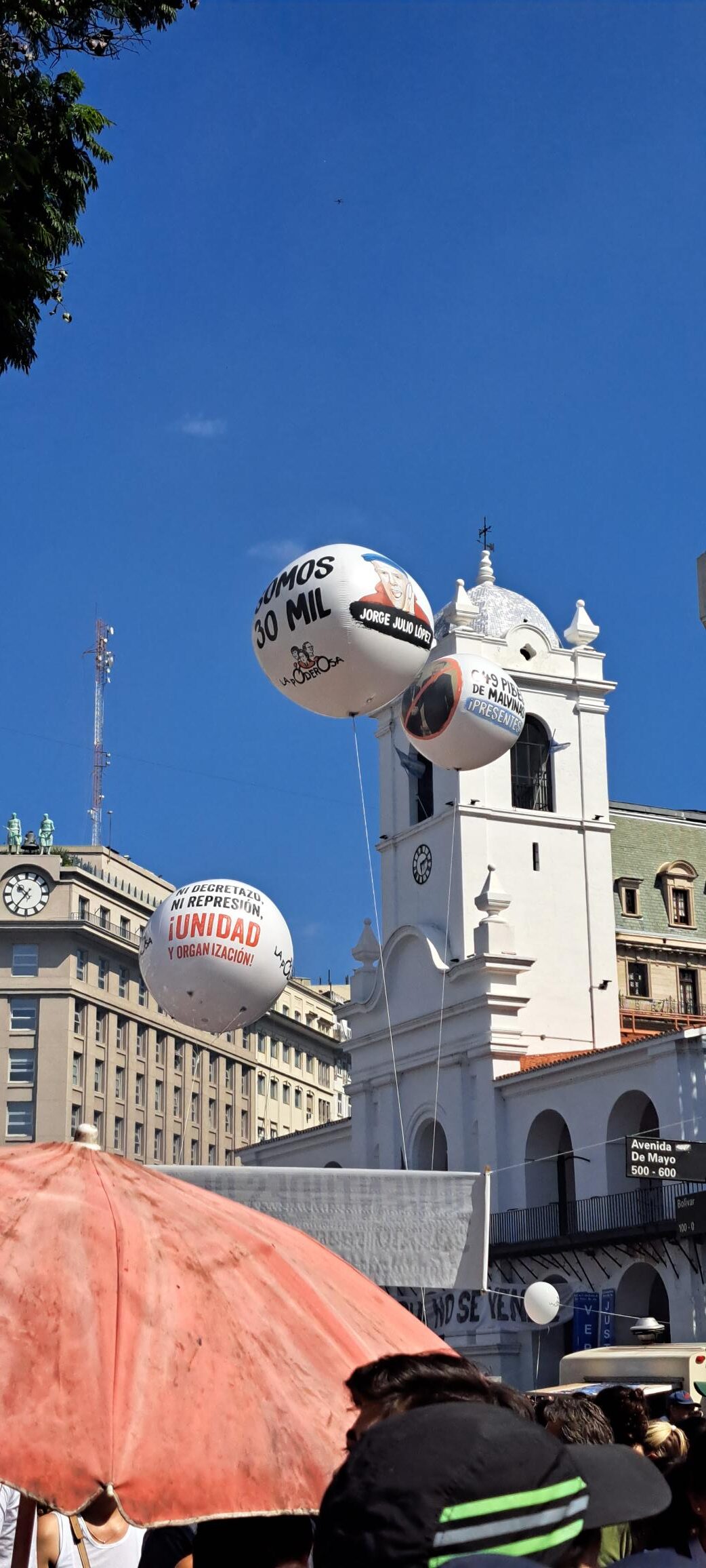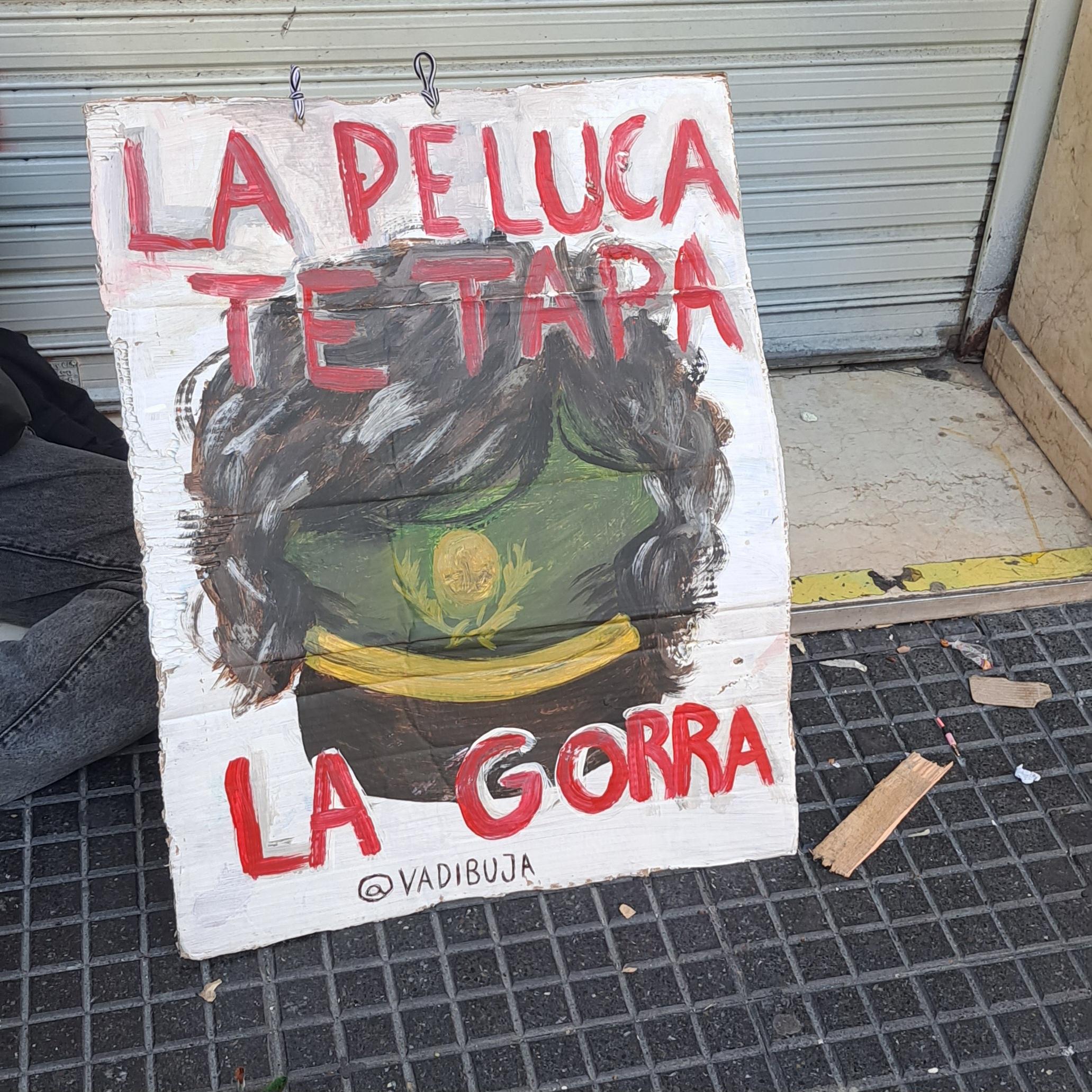 Otra secuencia repetida, una y otra vez en la plaza, en las conversaciones, en los graffitis, en las pegatinas, en los cánticos refiere a la tristeza y la oposición al actual gobierno negacionista que reivindica la dictadura con alusiones a Villarruel, Bullrich y el propio Milei. Asimismo la mención de un plan de hambre y ajuste similar al llevado a cabo por los militares se refleja en pancartas que cruzan toda la avenida de Mayo y que no son sólo de Agrupaciones partidistas o de la Garganta Poderosa, sino que se reparten en dibujos a mano y otros fotocopiados con los nombres de sus artistas en ellos.