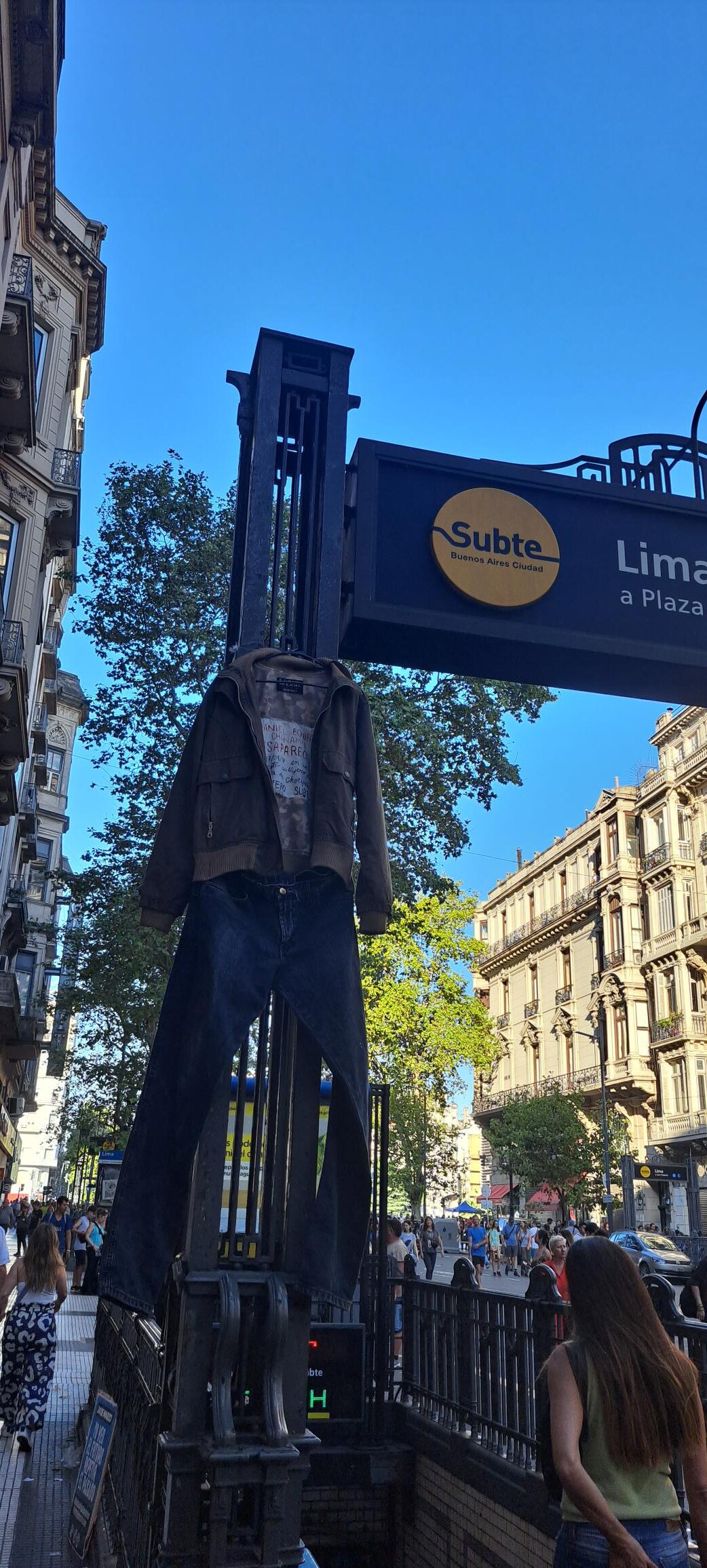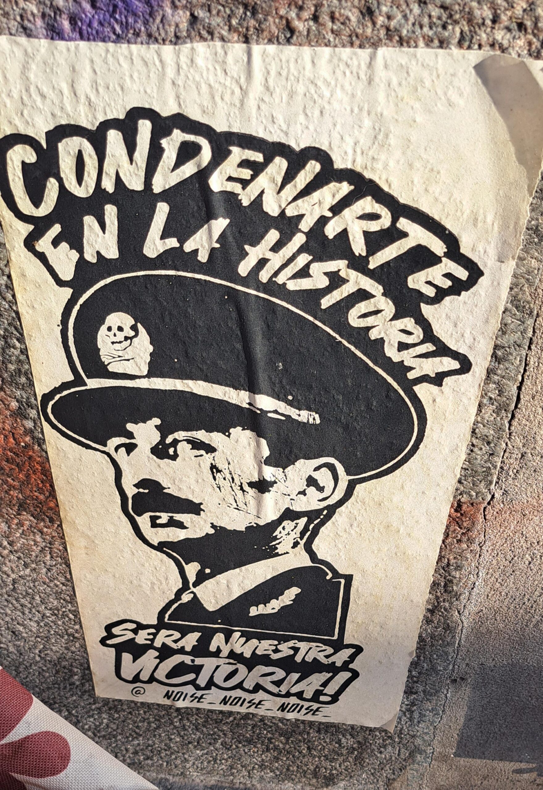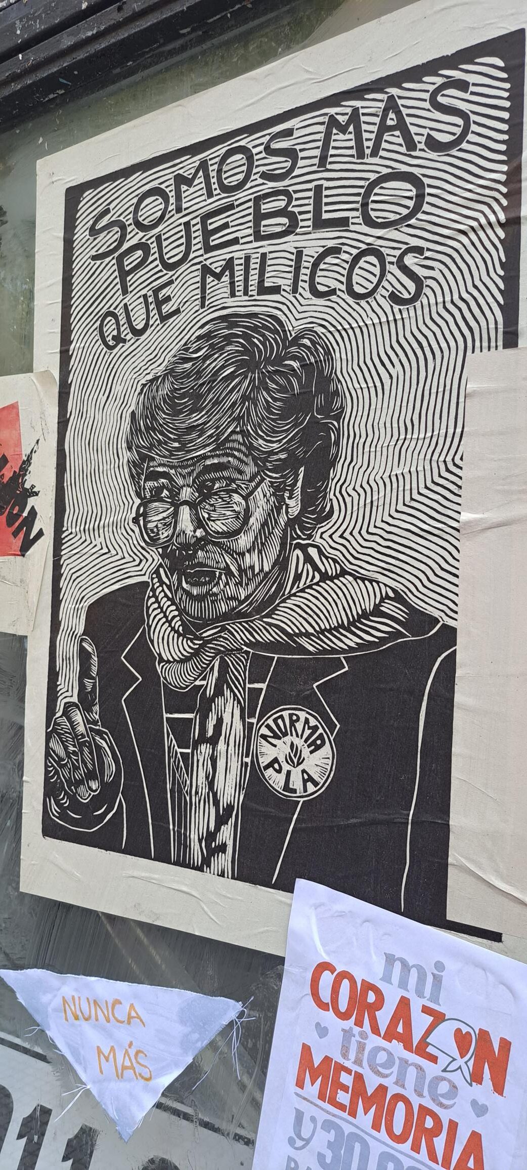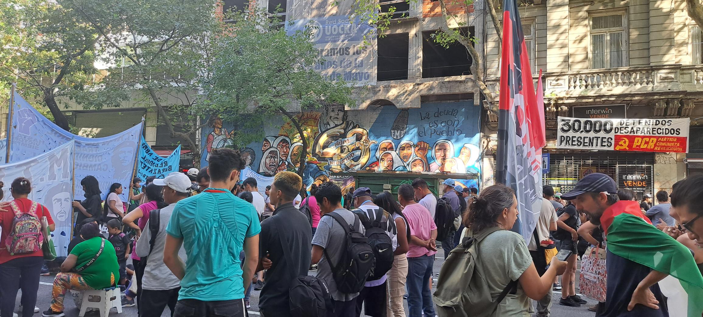 Otra secuencia repetida, una y otra vez en la plaza, en las conversaciones, en los graffitis, en las pegatinas, en los cánticos refiere a la tristeza y la oposición al actual gobierno negacionista que reivindica la dictadura con alusiones a Villarruel, Bullrich y el propio Milei. Asimismo la mención de un plan de hambre y ajuste similar al llevado a cabo por los militares se refleja en pancartas que cruzan toda la avenida de Mayo y que no son sólo de Agrupaciones partidistas o de la Garganta Poderosa, sino que se reparten en dibujos a mano y otros fotocopiados con los nombres de sus artistas en ellos.