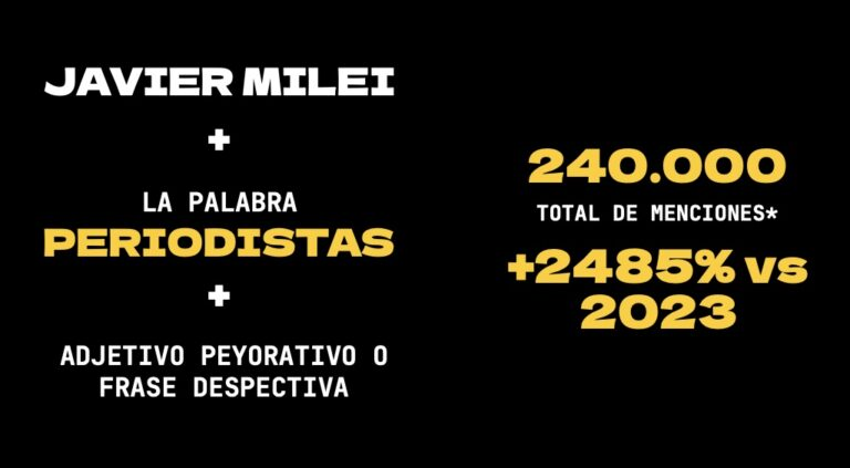 Un estudio específico de la consultora Methodo para FOPEA, basado en más de 2,4 millones de interacciones, concluyó que las agresiones del poder multiplican la violencia virtual contra la prensa. Las menciones peyorativas sobre el periodismo por parte del presidente Milei y cuentas afines sumaron 240.000 en 2024, un 2000% más que en 2023. Cada ataque verbal del mandatario genera un efecto multiplicador en las redes, instalando un clima hostil.