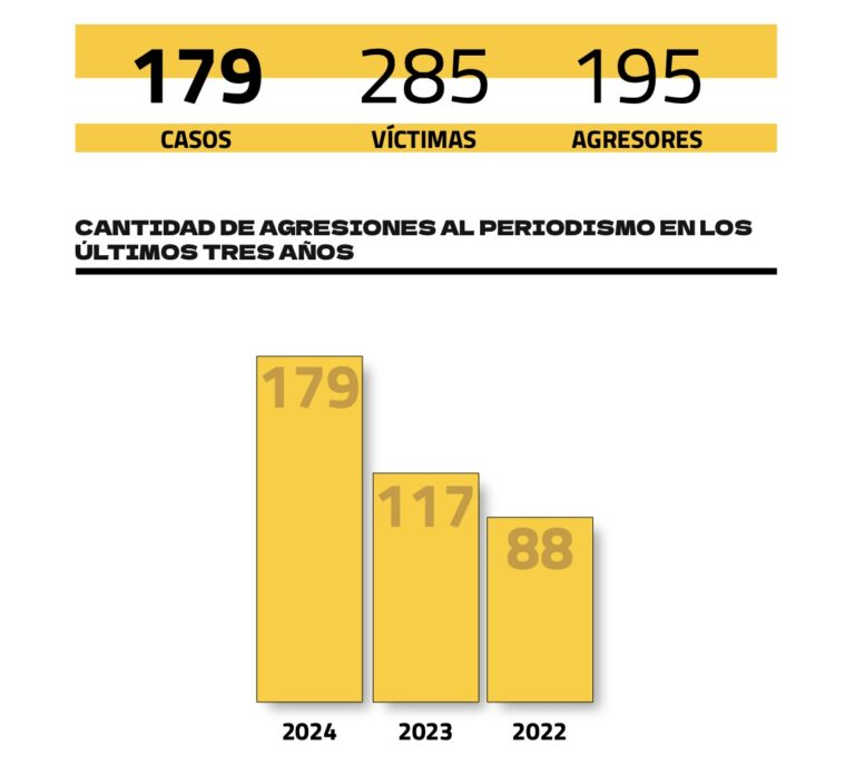 El poder político argentino fue el principal responsable de las agresiones contra periodistas durante 2024, representando el 52,5% de los 179 ataques detectados en todo el país. Este dato surge del informe anual del Monitoreo de Libertad de Expresión del Foro de Periodismo Argentino (FOPEA), titulado “El asedio al periodismo debilita la democracia”, presentado este lunes en el marco del Día Mundial de la Libertad de Prensa.