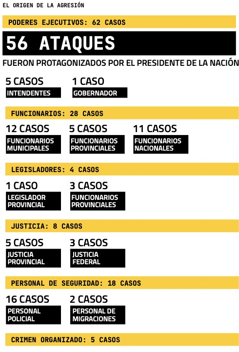 El informe revela un alarmante aumento del 53% en los casos registrados respecto a 2023 y un 103% en comparación con 2022. Del análisis se desprende que el presidente Javier Milei protagonizó 56 de los episodios denunciados, mayoritariamente a través de discurso estigmatizante, agravios o insultos.
