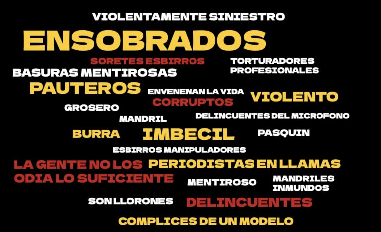 El estudio de la consultora generó una nube de palabras a partir de los términos y adjetivos usados por Milei y otros usuarios contra la prensa. Esta nube (visible en el gráfico adjunto) representa visualmente la frecuencia de uso: las palabras más repetidas aparecen en mayor tamaño. Entre los términos más destacados figuran “ensobrados”, “pauteros”, “imbéciles”, “violento”, “burra” y la frase “periodismo en llamas”. Con menor frecuencia, se observan otros como “esbirros”, “corruptos” y “soretes”.