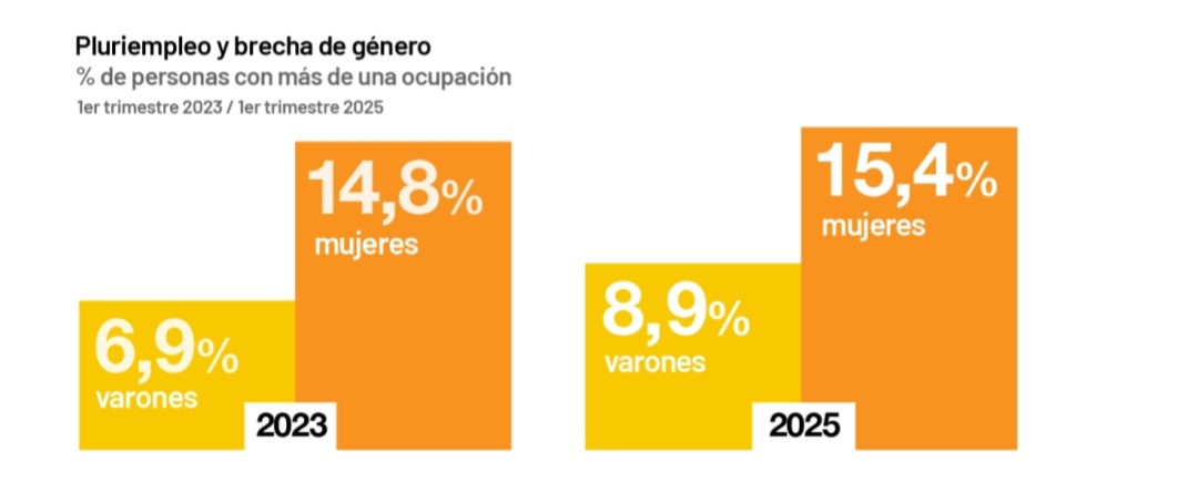 - Mientras el salario real cayó 5% en general y en el trabajo en casas particulares, el 15%, el tiempo para cuidar se achica: hubo incremento del pluriempleo. En las mujeres es el doble que en los varones. La discusión del uso del tiempo y los cuidados (como teletrabajo, licencias, art. 179) quedó anulada y a voluntad de la lógica de la empresa.