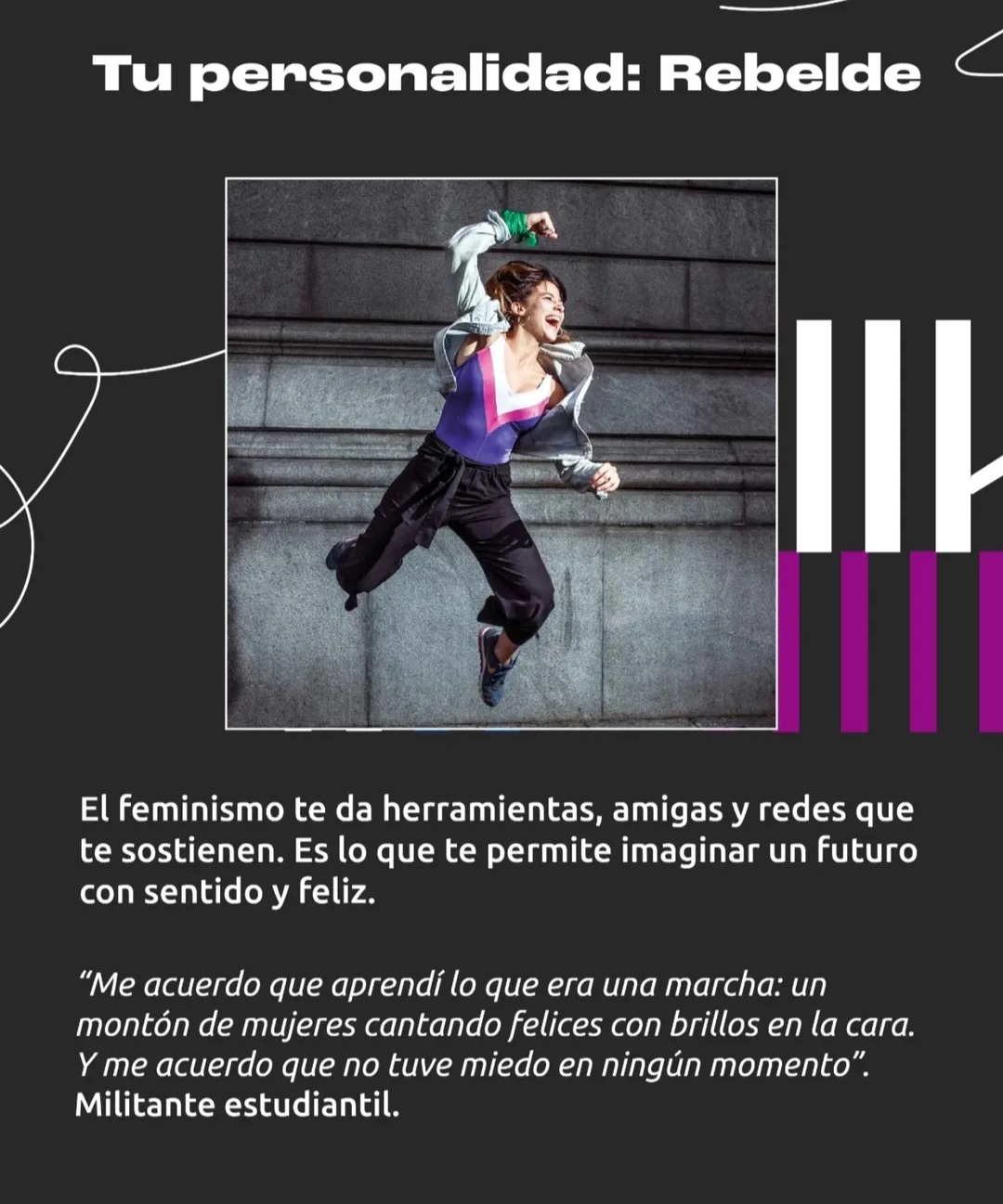 “Ser parte de esa ola feminista, de ir al Congreso y a las grandes movilizaciones. Desde una edad muy temprana participar y que después se concrete con la legalización del aborto era una sensación de “bueno, todo esto que hicimos, que no se reduce solo al 2018 sino que es una lucha histórica de muchísimos años pero que se vió condensado en esos años, tuvo su resultado en la legalización del aborto y fue muy flashero”.