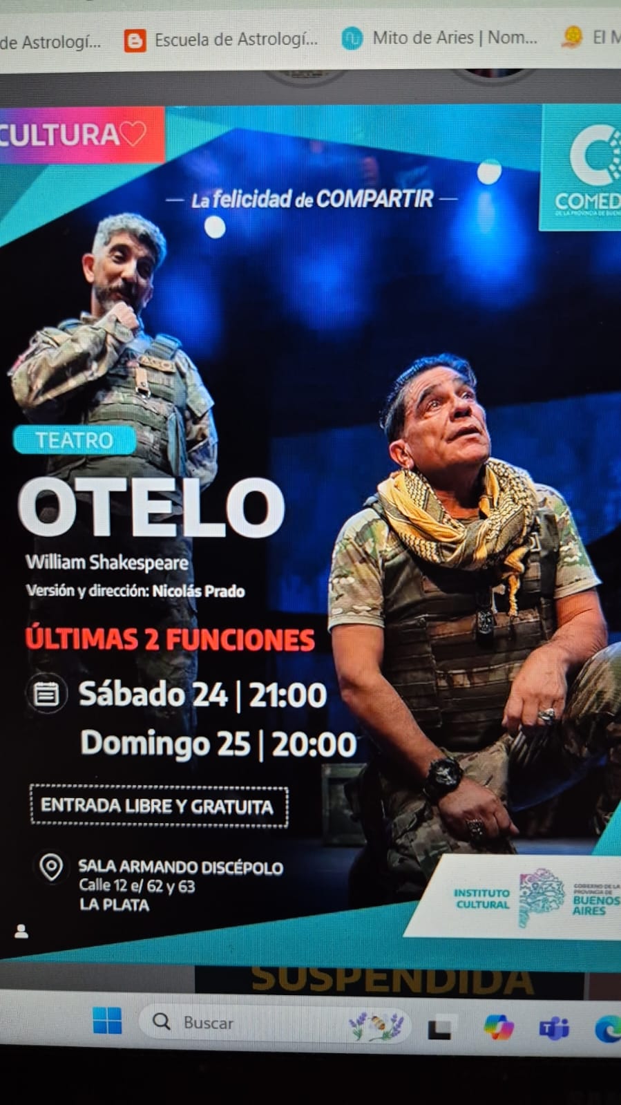 Un lujo para la ciudad fue ser escenario de esta obra que se había estrenado aquí, había viajado a Mar del Plata y volvió este año con un acompañamiento del público que superó todas las expectativas. Un clásico pero adaptado a las épocas que vivimos Otelo cuenta con el elenco de Juan Palomino (Otelo), Fabio Prado González (Yago), Erica Basaldella (Desdémona), Emma Burgos (Emilia), Francisco González Gil (Casio), Mario Moscoso (Rodrigo).
