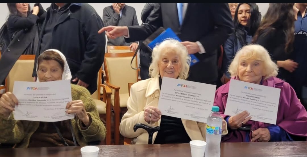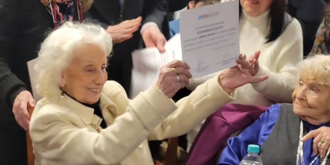 Estela de Carlotto recibió el Diploma como Miembro Honoraria de la Asociación Argentina de Profesores y Profesoras de Derechos Humanos en la Facultad de Derecho de la UBA, junto a Taty Almeida, Eduardo Barcesat, Aida Kemelmajer de Carlucci, Adolfo Pérez Esquivel, Nelly Minyersky, Luis Niño, Alicia Ruiz, Juan Carlos Wlasic y Eugenio Zaffaroni, entre otras personalidades.