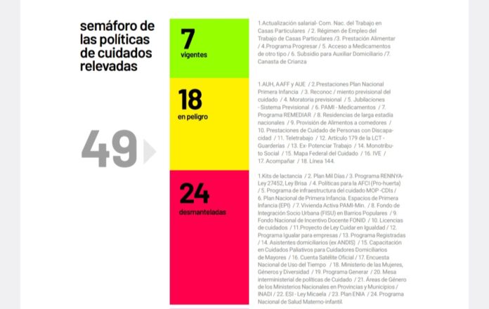 En cuanto a las políticas de cuidado, el ajuste también sigue en marcha: de 49 relevadas, 24 se derogaron o discontinuaron mientras que otras 18 están en riesgo o sub ejecutadas. Sólo 7 se mantienen vigentes.