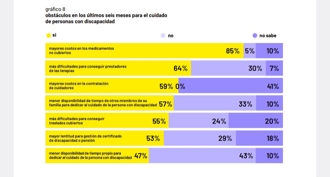 – En los hogares con personas con discapacidad, la principal dificultad aparece con la suba de precios de los medicamentos, identificada por el 85% de las familias. El 64% también afirmó estar teniendo mayores dificultades para obtener prestadores para las terapias.