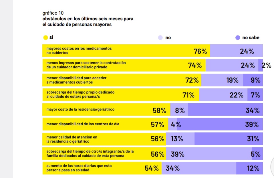 – En los hogares con personas mayores, el 76% de las familias dijo percibir mayores costos en los medicamentos no cubiertos por el PAMI y el 74% declaró contar con menores ingresos para contratar cuidados para estas personas.