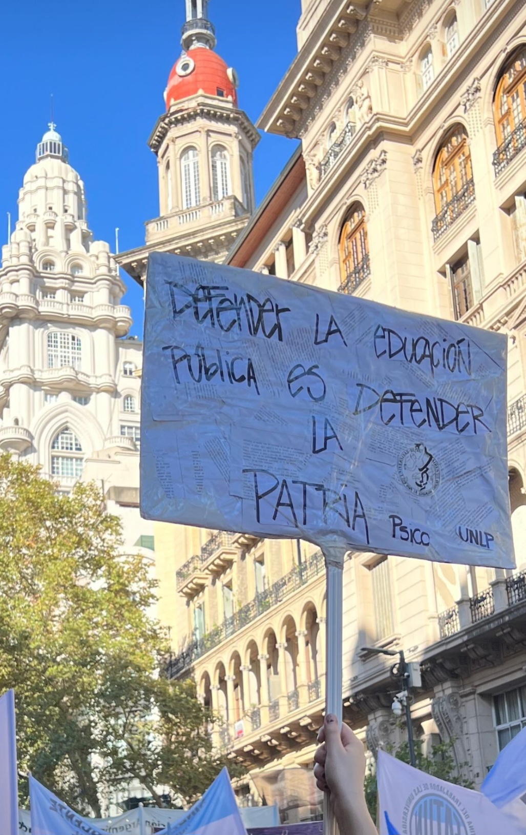 Si bien hubo banderas que identificaban grupos o facultades y universidades lo que más abundó fueron los carteles hechos a mano, algunos sobre cartones improvisados, otros más artísticos y con colagges. En ellos se leían frases como «Que el privilegio no te nuble la empatía». «Rebelate y educate». «Más plata para educar, no para reprimir». «Más Télam, Menos Twitter».. «No nos querés libres, nos querés ignorantes». «Viva la educación, carajo». «Milei, date cuenta, Conan está muerto y la universidad pública más viva que nunca»: «Los lápices siguen escribiendo». «La educación no se vende, se defiende», «Exigimos con la nuestra bancar la universidad», «Sin ciencia no hay Conan», «Educación pública = movilidad social», «No hay libertad sin un pueblo estudiante», «Villero y universitario, el terror de los libertarios». «Universidad pública en peligro». “Estudiá no seas un Adorni” “Dejenme cursar, todavía no entendí a Lacan”“Prefieren comprar misiles que libros”y hasta los vendedores se sumaron a la cruzada con frases “ Birra fría como el corazón de Milei”.