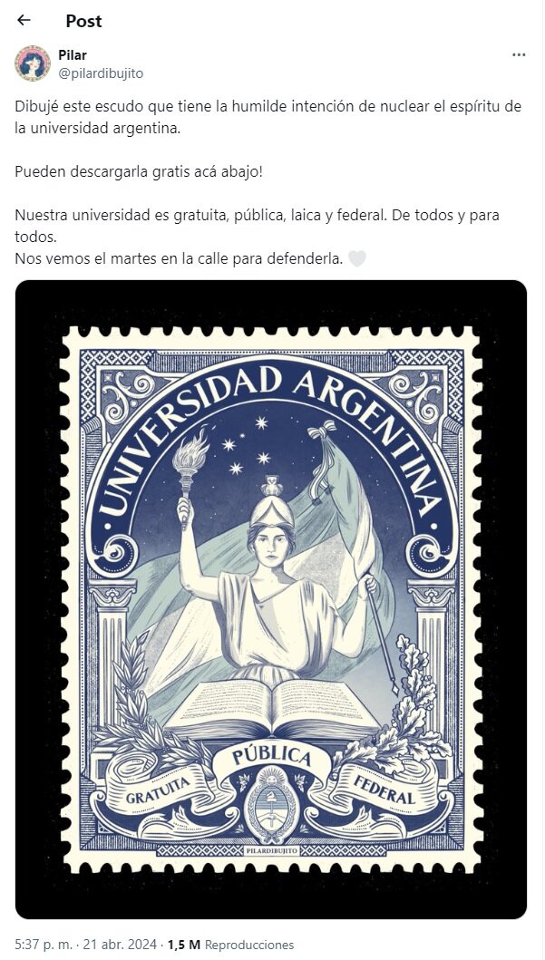 Entre los carteles que se vieron no solo en las marchas sino también en las redes uno que se repitió por miles fue la creación de una ilustradora Pilar Veiga, conocida en las redes por @pilardibujito que compartió un escudo que le llevó 13 horas dibujarlo y permitió que lo bajaran e imprimieran para esta marcha.