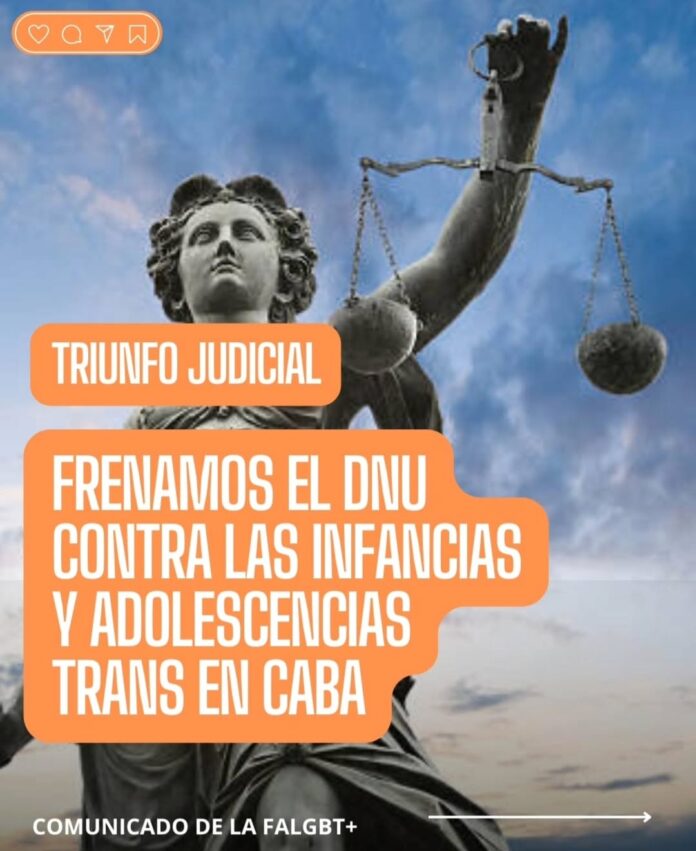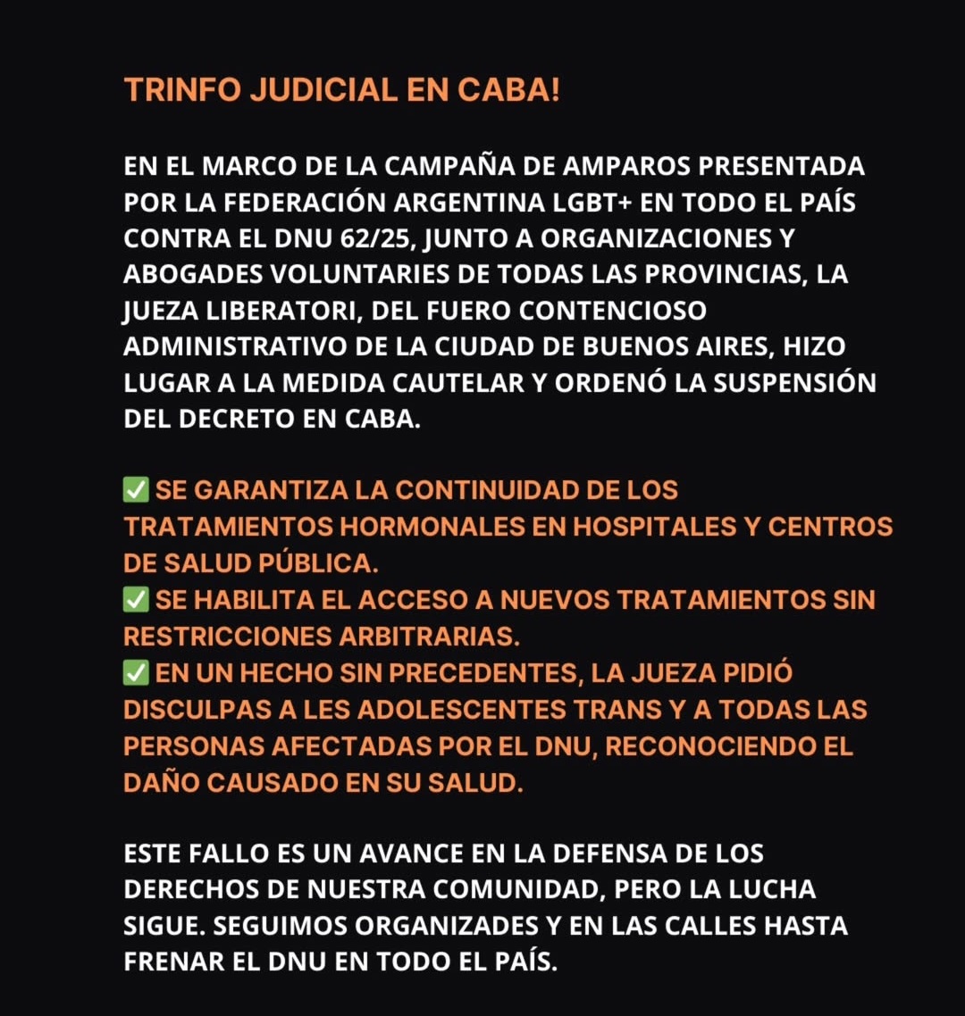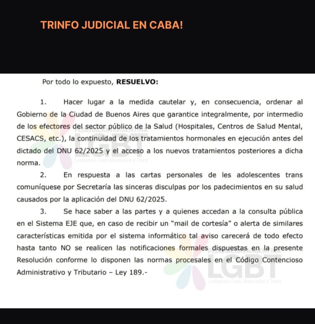El amparo lo dio la jueza Elena Liberatori, del fuero Contencioso Administrativo de la Ciudad de Buenos Aires, ante un pedido de la Federación Argentina de Lesbianas, Gays, Bisexuales y Trans (FALGBT) en el que garantiza la continuidad de los tratamientos hormonales en hospitales y centros de salud pública para menores de edad. «En un hecho sin precedentes, la jueza pidió disculpas a les adolescentes trans y a todas las personas afectadas, reconociendo el daño causado en su salud», destacaron desde la FALGBT en un comunicado.