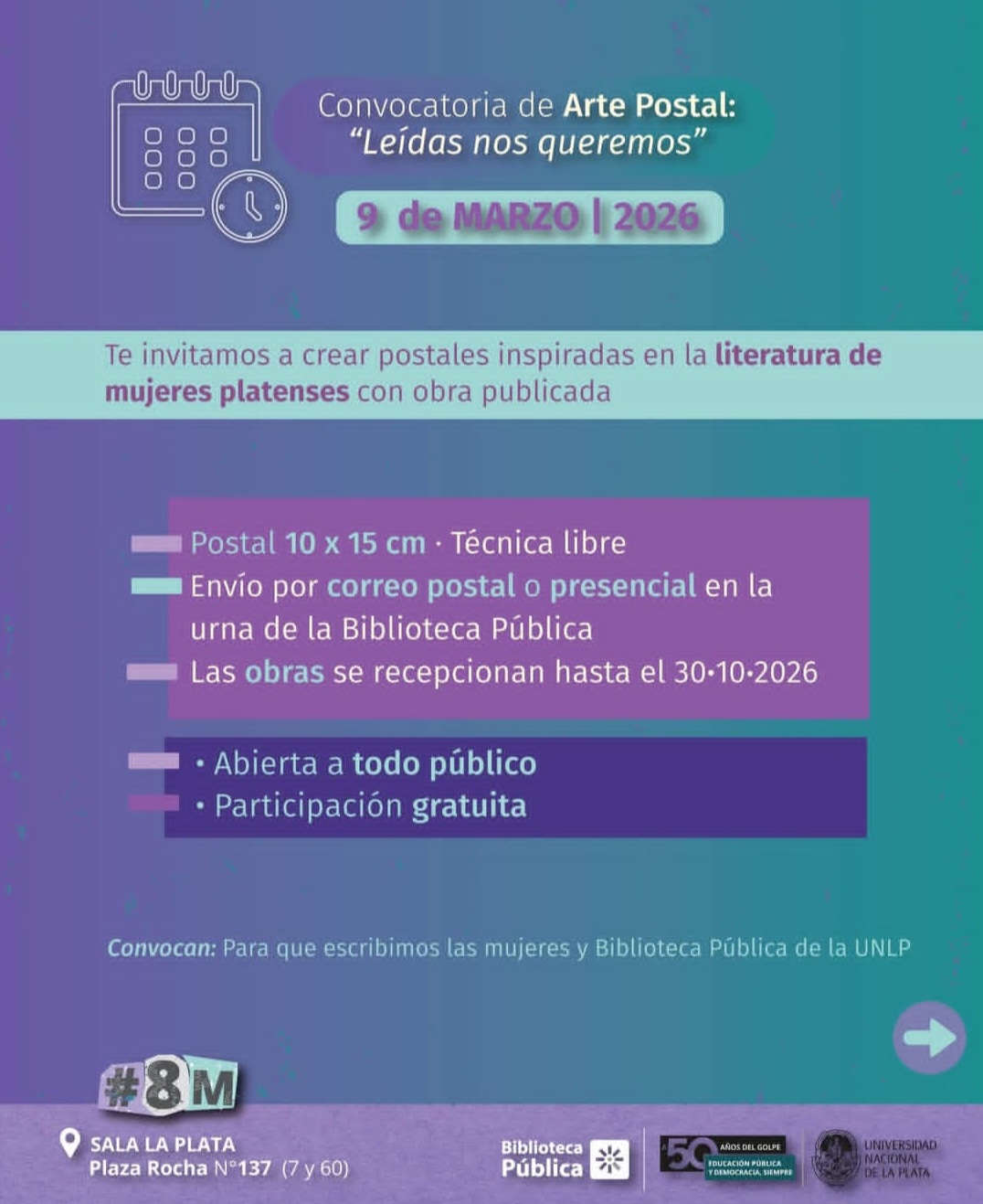 En este marco, desde el proyecto Para que escribimos las mujeres y la Biblioteca lanzaron una nueva convocatoria de arte postal. La invitación es a crear una postal inspirada en la literatura escrita por mujeres platenses con obra publicada: poesía, narrativa, libros que nos marcaron y autoras que queremos seguir leyendo y difundiendo.