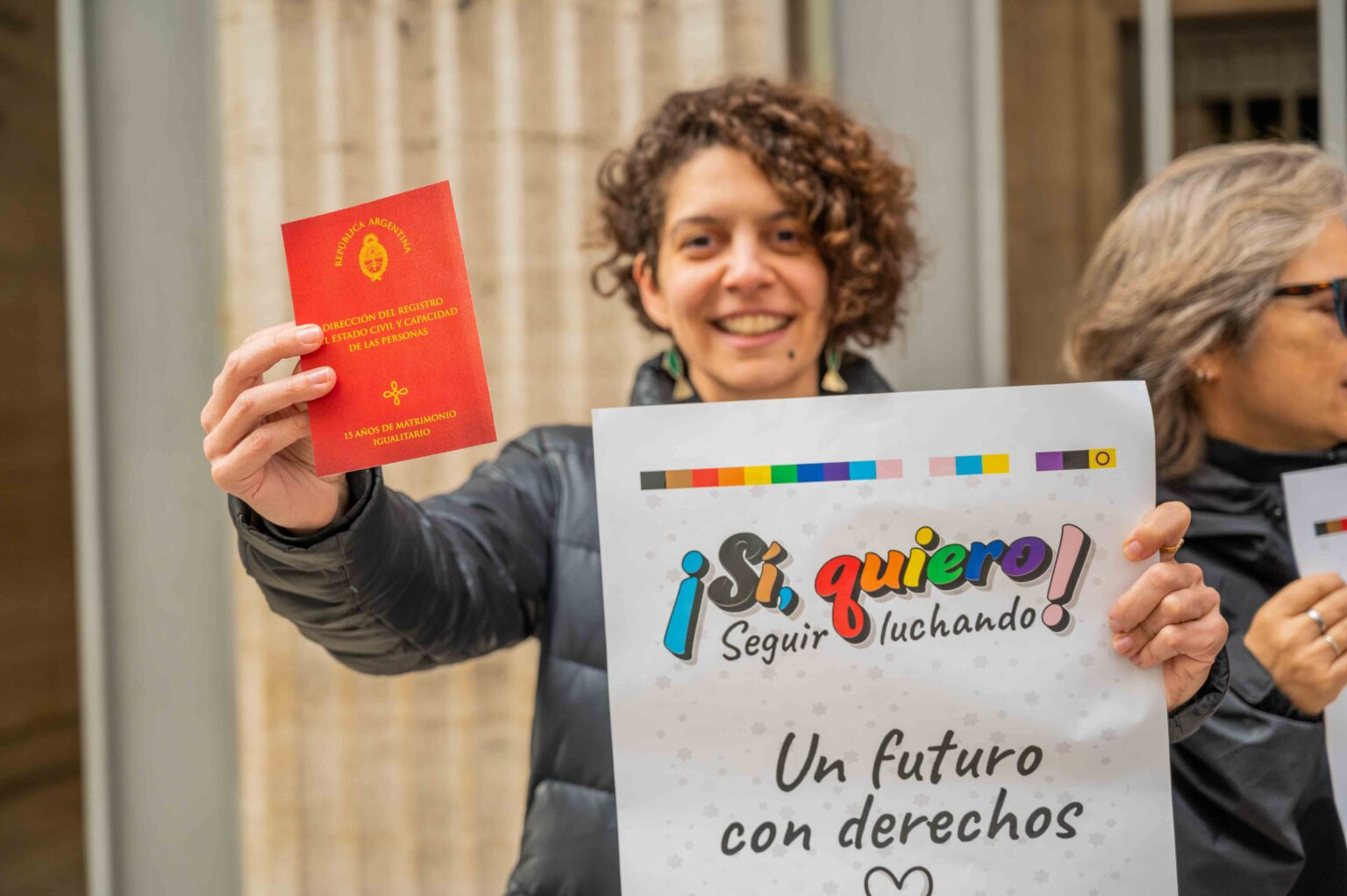 La activista Greta Pena, ex directora del Inadi y de la Subsecretaría de Políticas de Diversidad del Ministerio de Mujeres, Géneros y Diversidad, se casó con su compañera en este registro civil hace 15 años. “No queríamos entrar a esta institución para asimilarnos, sino que queríamos conformar una forma más democrática de familia. Y eso se logró: luego del matrimonio igualitario llegó la posibilidad de la voluntad procreacional, de poder conformar familias donde el norte fuese el deseo y la voluntad. Hoy las parejas heterosexuales puede poner su apellido al lado de su compañero, incluso puede ponerlo primero. Luego vino la Ley de Identidad de Género y luego la posibilidad de acceder a un aborto legal, seguro y gratuito”, expresó a le sparticipantes. Durante la actividad también estuvo presente la ex ministra de Géneros, Elizabeth Gómez Alcorta. En la cuadra del registro civil, José y Gerardo se cubrían bajo un paraguas con los colores del orgullo y llevaban puesta su alianza de matrimonio y su libreta roja. “Venimos a celebrar que estamos juntos, que nos casamos, que tenemos derechos. No necesitábamos esto para estar juntos, pero sí para que nos reconocieran los mismos derechos que ya tenían las demás personas. Dejamos de ser ciudadanos de segunda”, dijo Gerardo a Presentes. José agregó: “Son solamente 15 años que pasaron desde que empezamos a ser iguales a otros, es muy poco. Faltan otros derechos”.