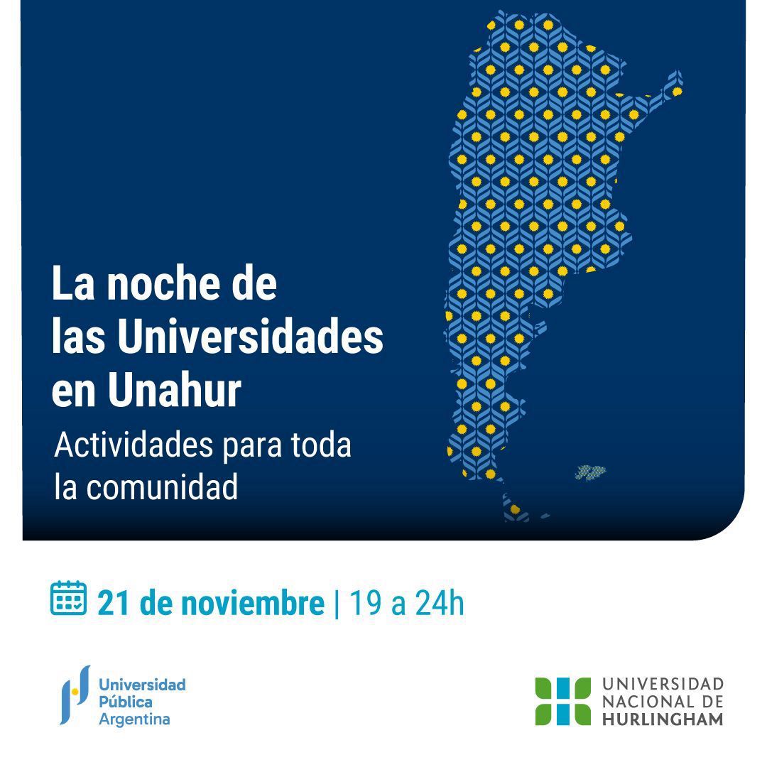 La Universidad Nacional de Hurlingham (UNAHUR) se suma a la celebración de los 75 años de la gratuidad universitaria en la Noche de las Universidades. El 21 de noviembre, entre las 19 y las 24 hs, las universidades públicas de la Argentina ofrecerán a toda la comunidad actividades culturales, musicales, académicas, de investigación y científicas.