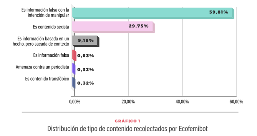 El análisis cuantitativo de 317 contenidos muestra que la desinformación con intención de manipular constituye la categoría predominante (59,81%), seguida del contenido sexista y estereotipado (29,65%).