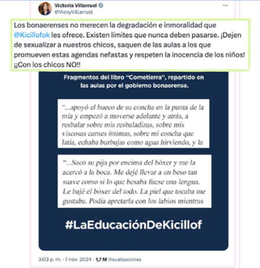 -Pánico Moral: Se genera una reacción social exagerada e irracional frente a fenómenos que se perciben como amenazas a los valores y normas sociales. Esta estrategia amplifica casos excepcionales para presentarlos como problemas generalizados, como se observó en campañas de desinformación contra la ESI o en la manipulación de imágenes sobre el libro Cometierra, de Dolores Reyes que buscaban movilizar emociones primarias como el miedo y la indignación.
