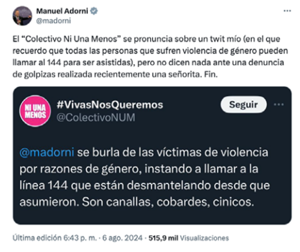 En este contexto, la violencia simbólica ejercida por los discursos de odio se articula con la violencia material, como lo ilustra el caso paradigmático del ataque sufrido por la periodista digital Julia Mengolini o el crimen de odio ocurrido el 6 de mayo de 2024 (triple lesbicidio en Barracas), donde el odio se ve alimentado y validado por la narrativa estatal y pública.