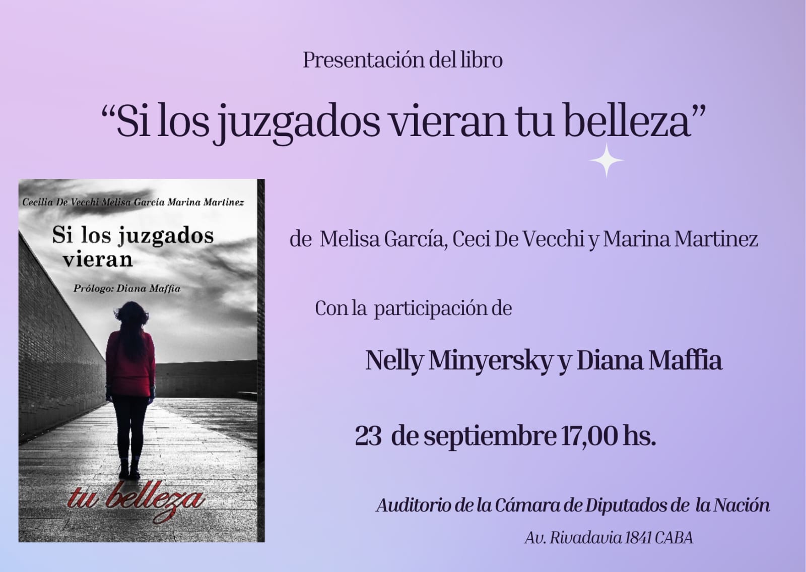 El próximo 23 de septiembre a las 17 hs se realizará la presentación del libro “Si los juzgados vieran tu belleza” una obra conjunta de Melisa García, Ceci De Vecchi y Marina Martínez que aborda la historia de siete mujeres que vivieron hechos de violencia de género.