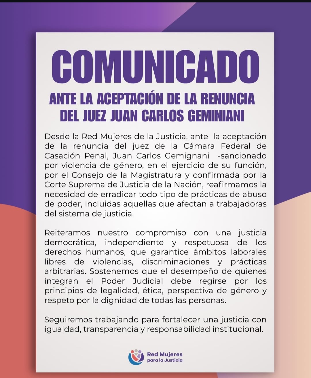 La red Mujeres de la Justicia realizó un comunicado al respecto de la aceptación de su renuncia.