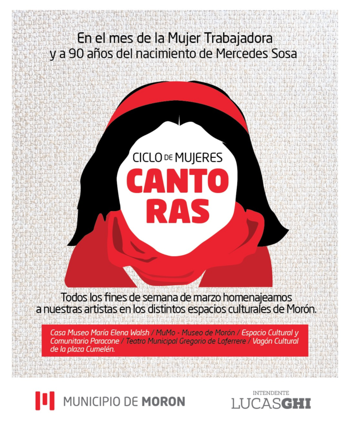 El Municipio presenta un ciclo protagonizado por cantantes en el marco del Mes de la Mujer Trabajadora y a 90 años del nacimiento de la entrañable Mercedes Sosa. Durante todo el mes, se ofrecerán espectáculos musicales gratuitos en diversos espacios culturales del distrito.