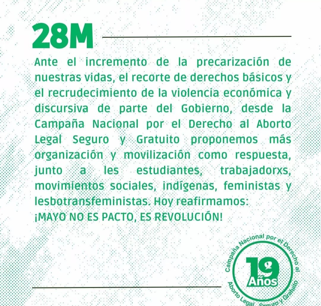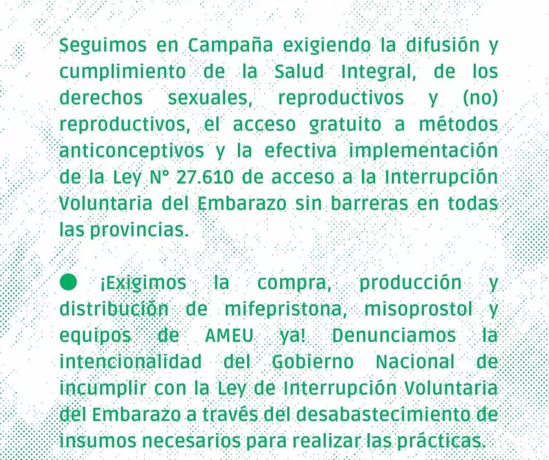 La Campaña exige al Gobierno la compra, producción y distribución de insumos como mifepristona, misoprostol y equipos de AMEU para garantizar el cumplimiento de la Ley de IVE. Además, demanda la plena implementación de la Educación Sexual Integral, la separación de las Iglesias y el Estado, y el cese de los discursos y crímenes de odio que afectan a la comunidad LGBTTINBQ+.