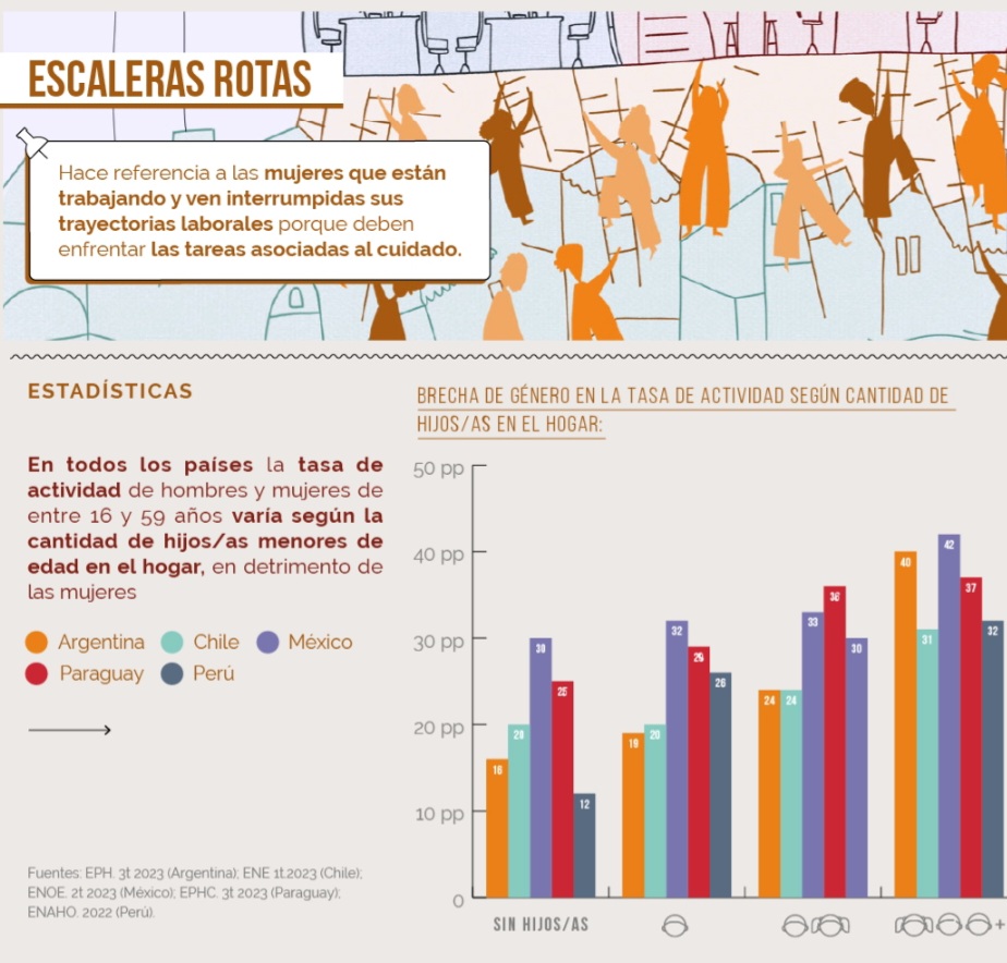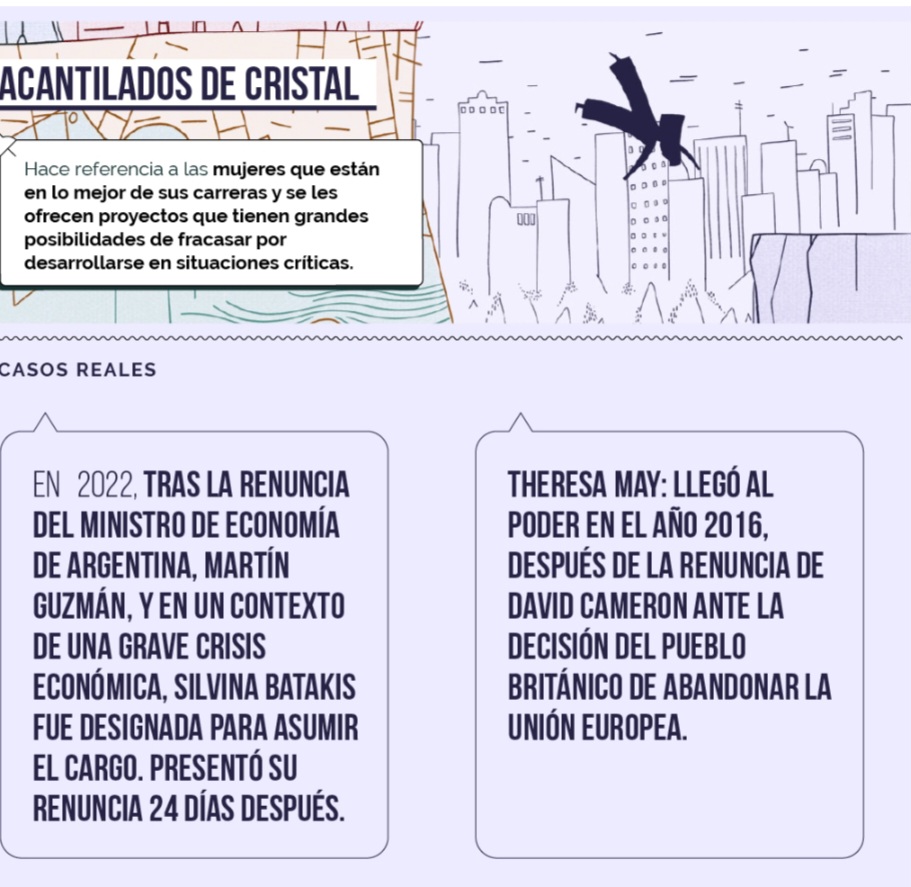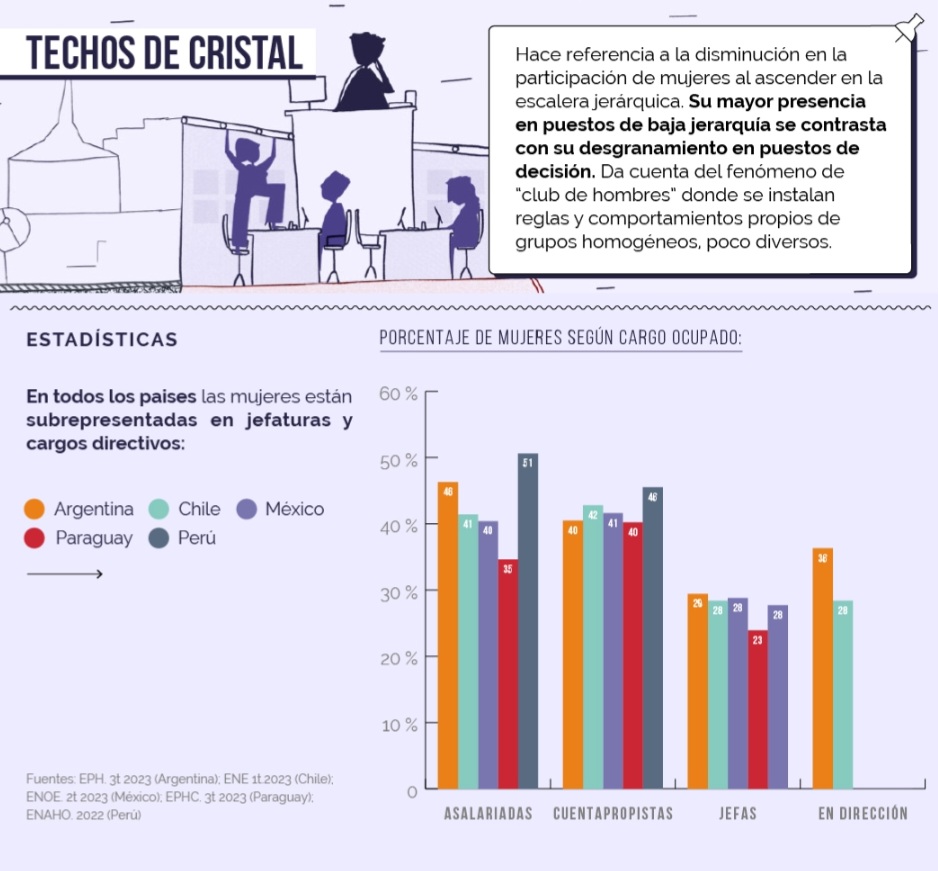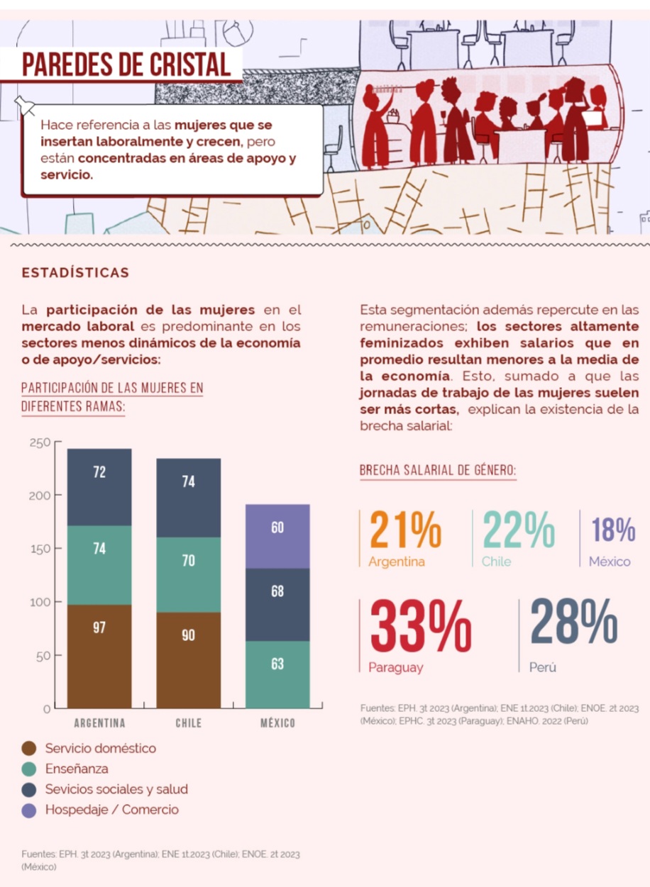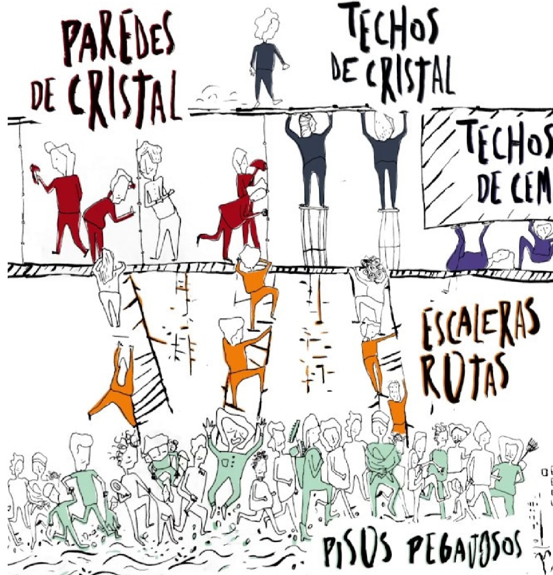 En este sentido se llama “Paredes de Cristal” a lo que ocurre cuando las mujeres se insertan laboralmente y crecen, pero están concentradas en áreas de apoyo y servicio, sectores altamente feminizados y con salarios bajos. Esta compleja situación puede comprenderse mejor entrelazada con otros escenarios como “pisos pegajosos” y “escaleras rotas”: las mujeres son quienes mayormente asumen las tareas de cuidados y eso limita su nivel de estudios y su desarrollo y crecimiento profesional.