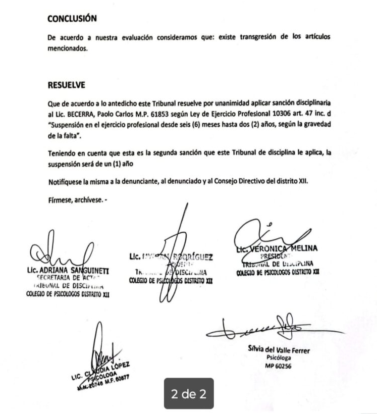 Paolo Carlos Becerra es un psicólogo de la localidad bonaerense de Quilmes denunciado penalmente por abuso sexual a mujeres en situación de vulnerabilidad. El Tribunal de Disciplina del Colegio de Psicólogos del Distrito XII decidió suspender su matrícula aunque solo por 12 meses. «La forma de operar de esta persona es sutil, prolija, silenciosa. No puede quedar impune. Lo que hace es perverso. Atiende a población femenina en estado de vulnerabilidad, y se aprovecha de eso para obtener sus beneficios. Hace años que esto ocurre», expresó una de las denunciantes a través de medios públicos.