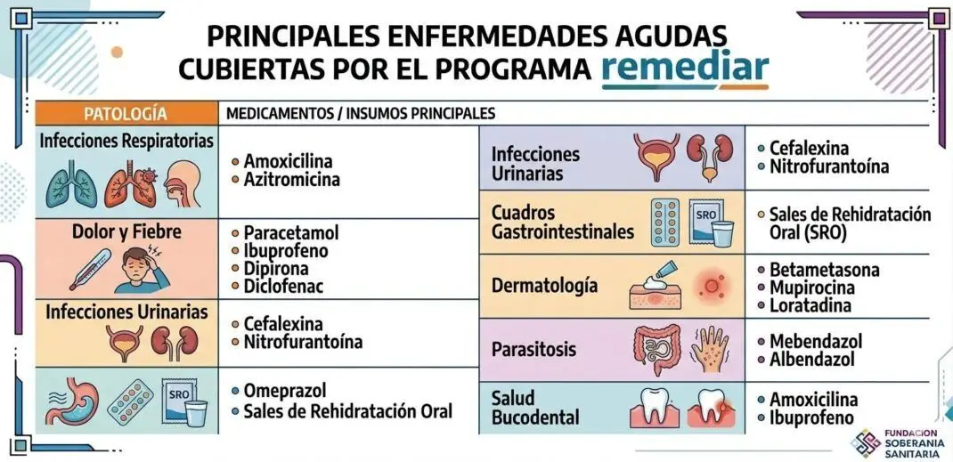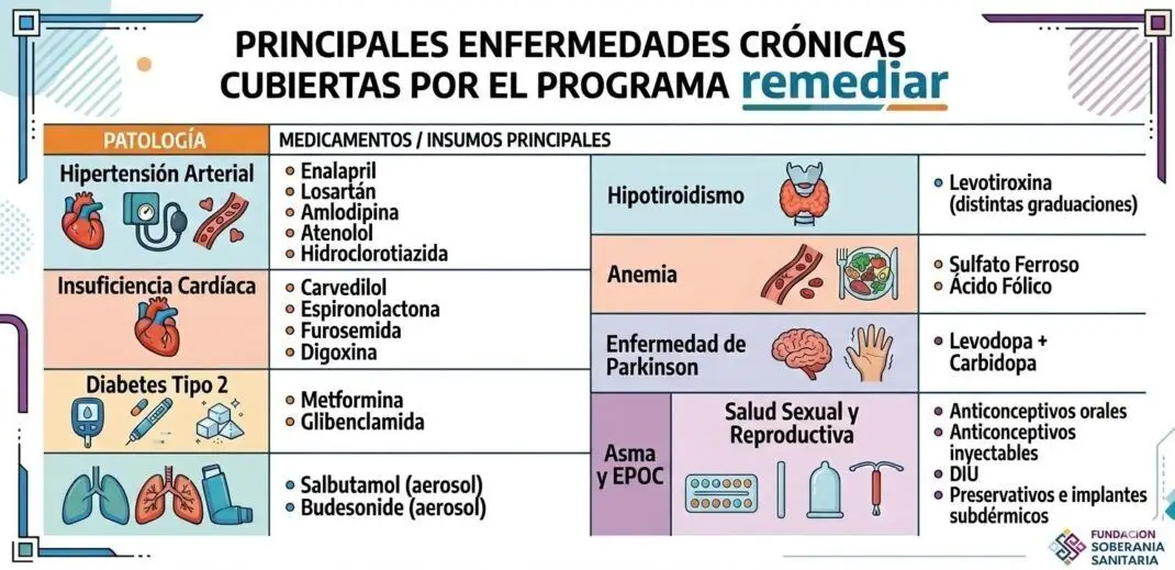 Según el informe de la Fundación Soberanía Sanitaria, Remediar cubría el 90% de las patologías más frecuentes en el primer nivel de atención. El vademécum incluía 79 presentaciones farmacológicas, desde medicamentos para diabetes e hipertensión hasta antibióticos, corticoides y antiparasitarios. La eliminación del programa implica que esos 79 medicamentos se reducen a solo tres, focalizados en enfermedades cardiovasculares, denuncia el estudio.