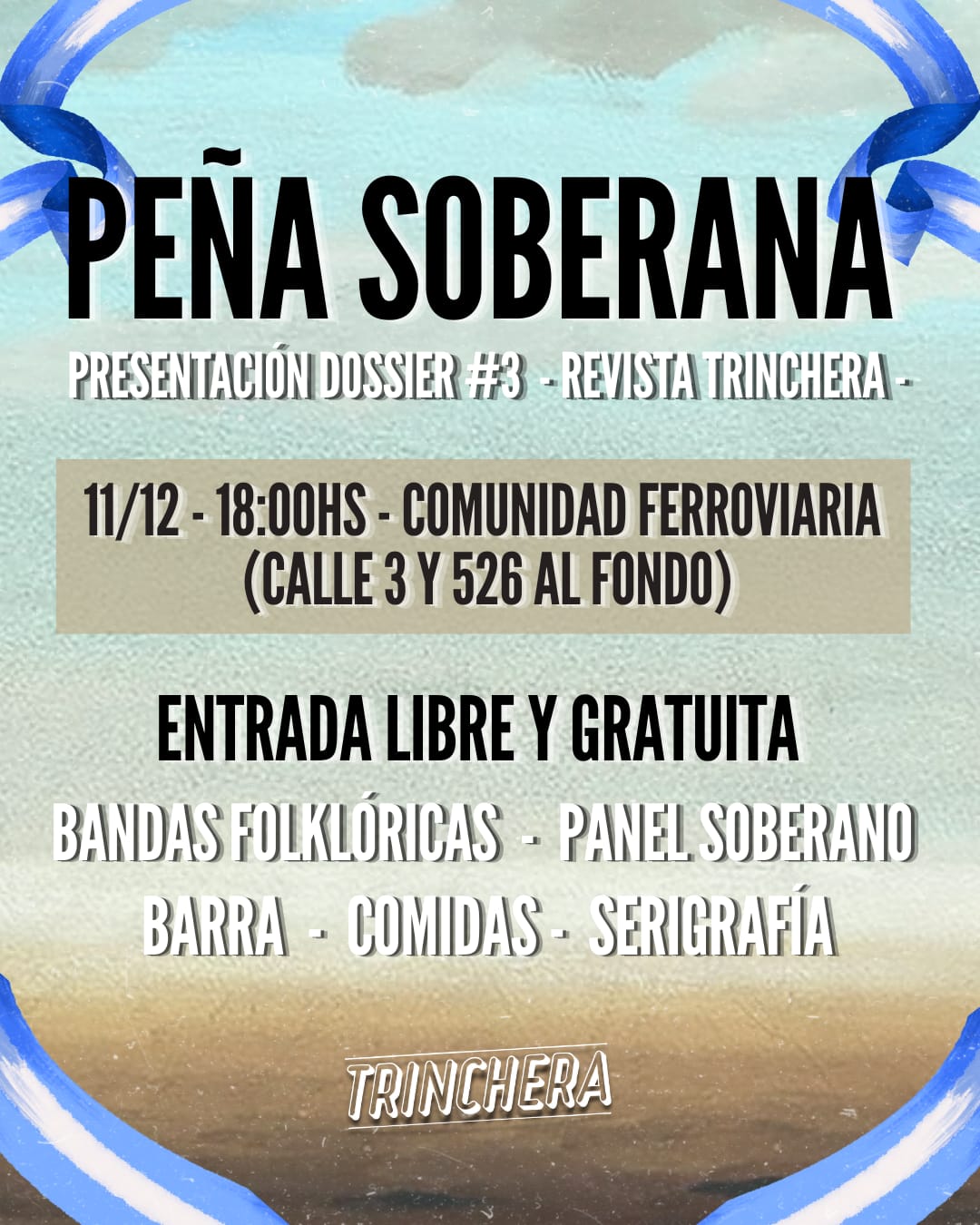 El jueves 11 de diciembre a partir de las 18:00 horas en Comunidad Ferroviaria (3 y 526, Tolosa, La Plata) se realizará la segunda peña del año, a puro debate soberano, música y danzas folklóricas. Además habrá serigrafía, comida y barra a precios populares. En la peña se presentará el DOSSIER #3 de Revista Trinchera: “Bicontinentalidad, Bioceanidad y Atlántico Sur”, junto a quienes se sumaron a esta edición gráfica. En el panel estarán presentes:David Pizarro Romero, Licenciado y Profesor en Historia. Mg en Estrategia y Geopolítica por la Escuela Superior de Guerra (UNDEF). Investigador del Instituto de Asuntos Internacionales y Estudios Políticos Manuel Ugarte, Universidad de Lanús (UNLa). Antártico;Dii Ocampo, militante y gestora cultural, profesora y bailarina de tango. Fotógrafa; Juan Cisilino, del Equipo de Investigación de la Cuestión Malvinas en la UNLP. Sociólogo y Doctor en Ciencias Sociales; Rodolfo Carrizo, Presidente del Centro de Ex Combatientes de Malvinas de La Plata