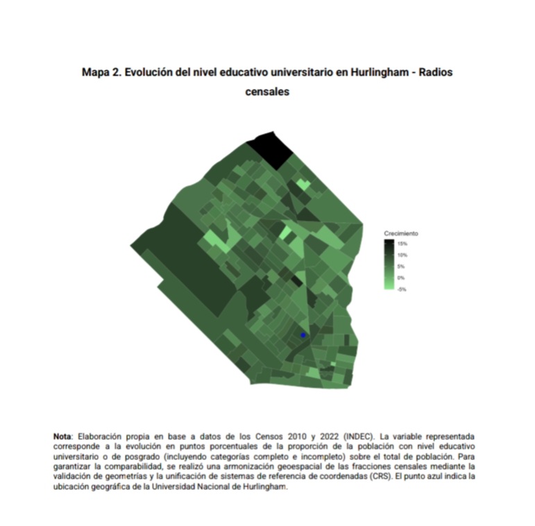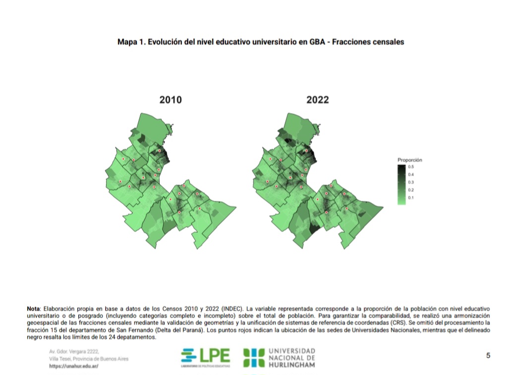 Basado en los datos de los censos nacionales 2010 y 2022 y en la matrícula georreferenciada de la UNAHUR, el estudio dimensionó el impacto territorial de las universidades nacionales del Conurbano Bonaerense en la población universitaria de esa zona.