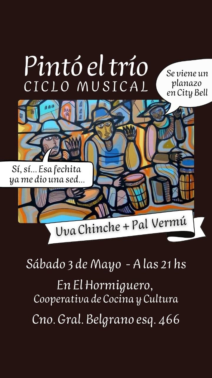 Tras el éxito de la primera entrega en la que se invita a compartir un ciclo musical de formaciones en trío. Esta primera fecha será en El Hormiguero, Cooperativa de Cocina y Cultura en (Camino General Belgrano y 466) con la presencia de Música rioplatense PAL VERMÚ